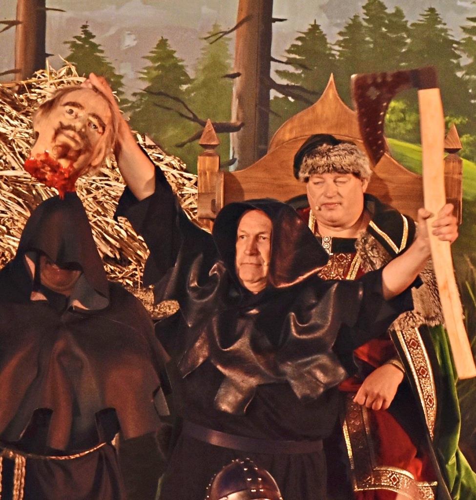 Der Leistung des Ensembles tat dies freilich keinen Abbruch: Hermann Maier lässt die Zuschauer die innere Zerrissenheit des kriegsmüden Söldnerführers Purmann spüren. Nach gewonnener Schlacht gegen die Magyaren im Jahr 913 am „Mordfeld“ bei Ötting ist es Ava, inbrünstig gespielt von Maria Lohr, die das Feuer in ihm wieder zum Lodern bringt. Ihr ist nach einem brutalen Überfall der Magyaren auf die Hochzeitsfeier ihrer Schwester Gesine (Andrea Lohr) die Flucht gelungen. Als verschlagener Bösewicht Etzelino sprüht Ludwig Reil vor Energie – selbst als ihm am Ende vor großem Publikum der Prozess gemacht wird, bleibt er herrlich widerspenstig. Am Ende senkt Herzog Arnulf, robust und mit starker Präsenz dargestellt von Walter Marchner, freilich dennoch den Daumen – und Henker Hauke Hammerl greift zum Beil, um dem durch Burgvogt Christoph Laibinger angestachelten Volk nach einem kräftigen Hieb Etzelinos Kopf zu präsentieren.